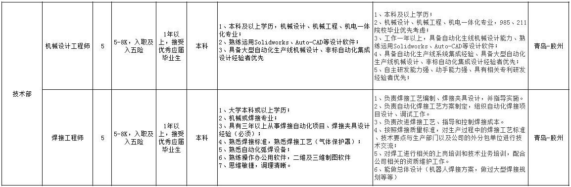 技術(shù)部:招機械設計工程師5名,焊接工程師1名